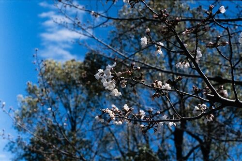 再生産されたリバーサルフィルムのEktachromeで撮りました。 VelviaともProviaとも違う、青が美しいフィルムです。 (Leica M5 / Voigtländer NOKTON 50mm F1.1 / Kodak Ektachrome E100) ▲浜町公園の桜。この空の色!この濃厚な青!すばらしい……。 (Leica M5…
