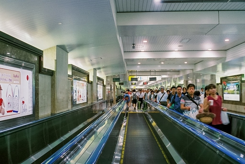 ▲長い長い、動く歩道。フィルムで撮ると手すりの樹脂っぽさが際立つ。