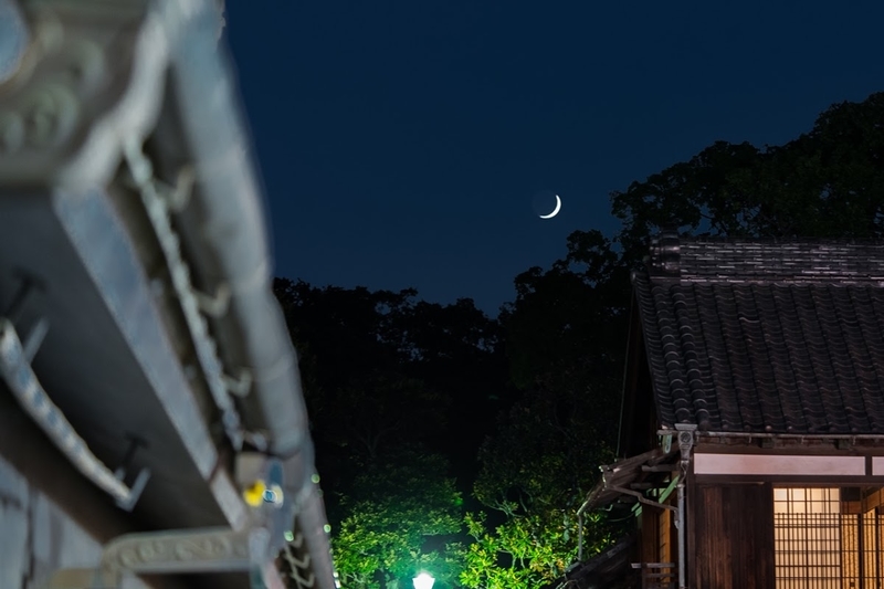 ▲うどんを食べたらもう20時近く。良い感じに月も出てきました。さて、撮りますか!